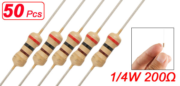Product Name Resistor Resistor Type Carbon Film Rated Power 1/4 W Resistance Value 200Ω Tolerance ± 5% Withstang Voltage 250V Body Size (Approx.) 5 x 2mm/0.2'' x 0.08'' (L*D) Lead Size (Each End) 20 x 0.4mm / 0.8" x 0.016" (L*D) Total Length 45mm/1.8'' Color As Picture Shown Weight 5g Package Content 50(±2%) x Carbon Film Resistors - Reviews