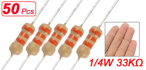 Product Name Resistor Resistor Type Carbon Film Rated Power 1/4 W Resistance Value 33KΩ Tolerance ± 5% Withstang Voltage 250V Body Size (Approx.) 20 x 0.2mm / 0.8" x 0.008"(L*D) Lead Size 5 x 1mm/ 0.196" x 0" (L*Max.D) Total Length 45mm / 1.8" Color As Picture Shown Weight 5g Package Content 50(±2%) x Carbon Film Resistors - Reviews