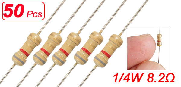 Product Name Resistor Resistor Type Carbon Film Rated Power 1/4 W Resistance Value 8.2Ω Tolerance ± 5% Withstang Voltage 250V Body Size (Approx.) 5 x 2mm/0.2'' x 0.08'' (L*D) Lead Diameter 0.3mm /0.01 Total Length 45mm /1.8'' Color As Picture Shown Weight 5g Package Content 50(±2%) x Carbon Film Resistors - Reviews
