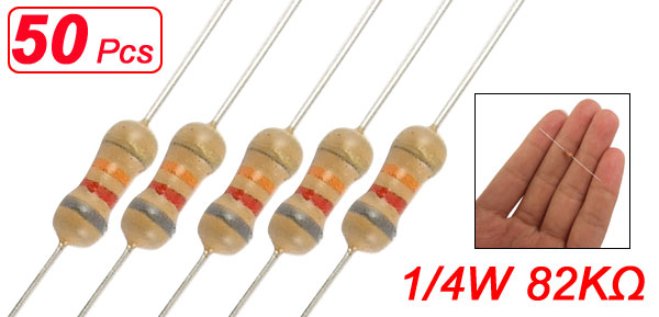 Product Name Resistor Resistor Type Carbon Film Rated Power 1/4 W Resistance Value 82KΩ Tolerance ± 5% Withstang Voltage 250V Body Size (Approx.) 20 x 0.2mm / 0.8" x 0.008"(L*D) Lead Size 5 x 1mm/ 0.196" x 0" (L*Max.D) Total Length 45mm / 1.8" Color As Picture Shown Weight 5g Package Content 50(±2%) x Carbon Film Resistors - Reviews