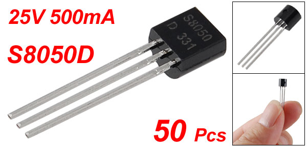 Product Name NPN Transistor Model S8050D Collector Base Voltage 40V Collector Emitter Voltage 25V Emitter Base Voltage 5V Collector Current(Continuous) 500mA Collector Power Dissipation 0.625W Pin Size 14 x 0.5mm/ 0.551" x 0.019" ( L* D) Body Dimension 4 x 3 x 4mm/ 0.16" x 0.12" x 0.16" (L*W*T) Pitch 1.5mm/0.059" Color Black Weight 13g Package Content 50(± 2%)x NPN Transistors - Reviews
