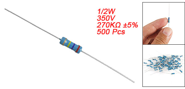 Product Name Carbon Film Resistor Lead Type Axial Power Rating 1/2W Resistance Tolerance ± 5% Resistance Value 270K Ohm Withstand Voltage 350V Size (Not Include Leads) 0.3 x 0.85cm / 0.12" x 0.33" (D*L) Leads Dia (Approx.) 0.03cm / 0.012" Total Length (Approx.) 5.5cm / 2.2" Color As Picture Show Weight 124g Package Content 500 Pcs (± 2%) x Carbon Film Resistors - Reviews