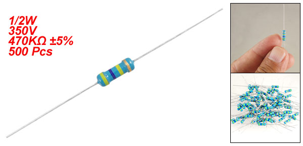 Details500 Pcs 1/2W 470K Ohm 5% Axial Carbon Film Resistors  Product Name Carbon Film Resistor Lead Type Axial Power Rating 1/2W Resistance Tolerance ± 5% Resistance Value 470K Ohm Withstand Voltage 350V Size (Not Include Leads) 0.3 x 0.85cm / 0.12" x 0.33" (D*L) Leads Dia (Approx.) 0.03cm / 0.012" Total Length (Approx.) 5.5cm / 2.2" Color As Picture Show Weight 123g Package Content 500 Pcs (± 2%) x Carbon Film Resistors