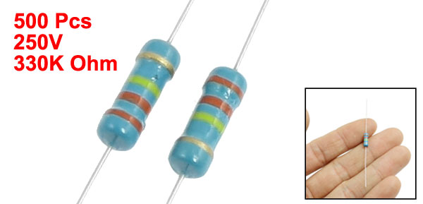 Product Name Carbon Film Resistors Material Type Carbon Film Rated Power 1/2 W Resistance Value 330K Ohm Tolerance +/-5% Withstand Voltage 250V Body Size (Approx.) 9 x 3 mm / 0.35" x 0.12" (L*D) Each Lead Length 2.5 cm / 1" Color As the Picture Show Weight 120g Package Content 500 (+/-2%) x Carbon Film Resistors - Reviews