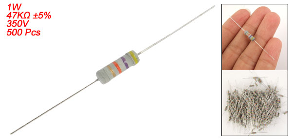 Product Name Carbon Film Resistor Material Type Carbon Film Rated Power 1W Resistance Value 47K ohm Tolerance ±5% Withstand Voltage 350V Body Size 10.6 x 3.6mm / 0.417" x 0.142" (L * D) Lead Size (Each End) 23 x 0.4mm/0.9" x 0.016" (L*Dia.) Color As Picture Shown Weight 160g Package Content 500 Pcs(±2%) x Carbon Film Resistors - Reviews