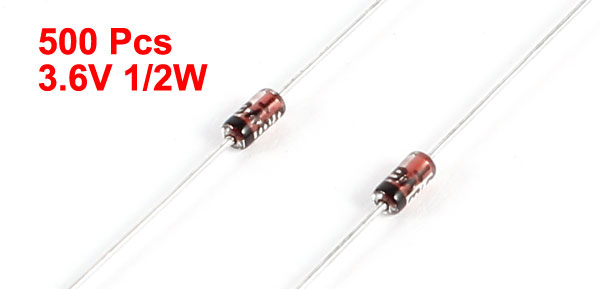 Product Name Zener Diodes Type DIP Tolerance ± 5% Rating Power 1/2 W Zener Voltage DC 3.6V Size(Not Include Leads) 0.36 x 0.18cm / 0.142" x 0.071"(L*D) Leads Dia(Approx) 0.04cm / 0.016" Overall Length(Approx) 6.cm / 2.4" Color As Picture Show Weight 53g Package Content 500(±2%) Pcs of Zener Diodes - Reviews