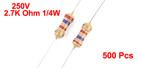 Product Name Carbon Film Resistors Rating Power 1/4W Resistance 2.7K Ohm Resistance Tolerance ± 5% Withstand Voltage 250V Size(Not Include Leads) 0.2 x 0.5cm / 0.08" x 0.2"(D*L) Leads Dia(Approx) 0.03cm / 0.012" Overall Length(Approx) 4.6cm / 1.8" Color Silver Tone Weight 50g Package Content 500 (±2%) Pcs of Carbon Film Resistors - Reviews