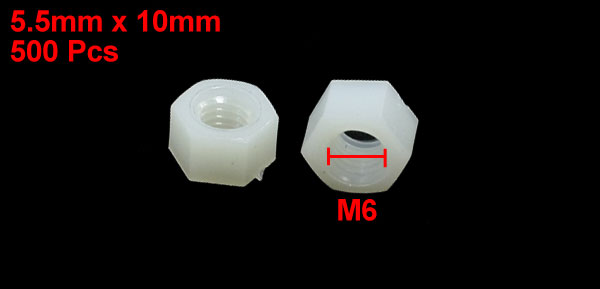 Product Name Hexagonal Threaded Spacer Thread Size M6 Total Size 5.5 x 10mm / 0.22" x 0.4" (H*D) Material Nylon Color White Net Weight 100g Package Content 500 Pcs (±2%) x Hexagonal Threaded Spacer  - Reviews