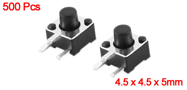 Product Name Tact Switch Type SPST Action Type Momentary Dimension 4.5 x 4.5 x 5mm / 0.18" x 0.18" x 0.2"(L*W*H) Button Dia 2mm / 0.08" Pin Length 1.5mm/0.06" Pin Spacing 3 x 2.5mm/0.12" x 0.1"(L*W) Material Plastic, Metal, Electric Parts Color Black, Silver Tone Net Weight 64g Package Content 500(±2%) x Tact Switch - Reviews