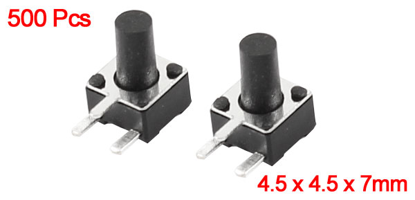 Product Name Tact Switch Type SPST Action Type Momentary Dimension 4.5 x 4.5 x 7mm / 0.18" x 0.18" x 0.28"(L*W*H) Button Dia 2mm / 0.08" Pin Length 1.5mm/0.06" Pin Spacing 3 x 2.5mm/0.12" x 0.1"(L*W) Material Plastic, Metal, Electric Parts Color Black, Silver Tone Net Weight 69g Package Content 500(±2%) x Tact Switch - Reviews