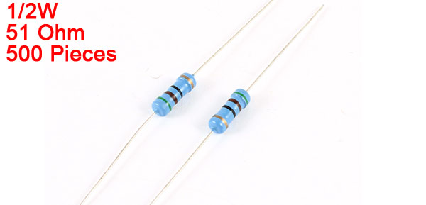 Product Name Metal Oxide Film Resistors Power Rating 1/2W Resistance Tolerance ± 5% Resistance 51 Ohm Size (Approx.) 59 x 3mm / 2.4" x 0.12" (L*Max.D) Main Color Silver Tone Weight 111g Package Content 500Pcs(±2%) x Metal Oxide Film Resistors - Reviews
