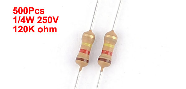Product Name Resistor Resistor Type Carbon Film Rated Power 1/4 W Resistance Value 120KΩ Tolerance ± 5% Withstang Voltage 250V Body Size (Approx.) 5 x 2mm/0.2'' x 0.08'' (L*D) Lead Size (Each End) 20 x 0.4mm / 0.8" x 0.016" (L*D) Total Length 45mm/1.8'' Color As Picture Shown Weight 30g Package Content 500(±2%) x Carbon Film Resistors - Reviews