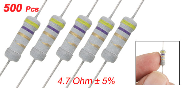 Product Name Carbon Film Resistors Rating Power 1W Resistance 4.7 Ohm Resistance Tolerance ± 5% Size(Not Include Leads) 1.03 x 0.3cm/ 0.4" x 0.12"(L*D) Leads Dia(Approx) 0.04cm/ 0.016" Overall Length(Approx) 5.8cm/ 2.3" Color See the Picture Weight 173g Package Content 500(±2%) Pcs of Carbon Film Resistors - Reviews