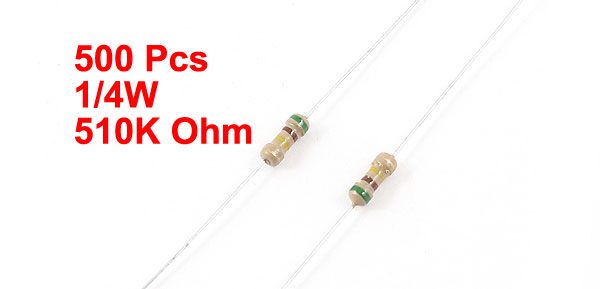 Product Name Carbon Film Resistors Material Type Carbon Film Rated Power 1/4W Resistance Value 510K Ohm Tolerance ±5% Body Size(Approx.) 6 x 2.5mm/ 0.24" x 0.1"(L*Max.D) Total Length 61mm/2.4" Color As Picture Shown Weight 51g Package Content 500 (± 2%) x Carbon Film Resistors - Reviews