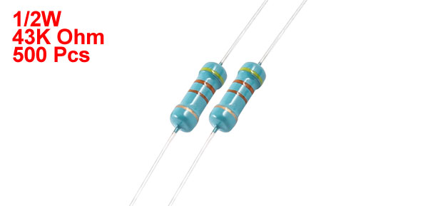Product Name Metal Film Resistors Power Rating 1/2W Resistance 43K Ohm Tolerance ±1% Total Length(Approx.) 6cm /2.4" Body Size 3 x 9mm/0.12" x 0.35"(D*L) Color As Picture Show Weight 120g Package Content 500(± 2%) x Metal Film Resistors - Reviews