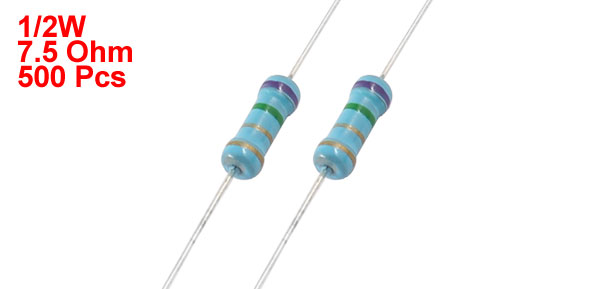 Product Name Metal Film Resistors Power Rating 1/2W Resistance 7.5 Ohm Tolerance ±1% Total Length(Approx.) 6cm /2.4" Body Size 3 x 8mm/0.12" x 0.31"(D*L) Color As Picture Show Weight 121g Package Content 500(± 2%) x Metal Film Resistors - Reviews