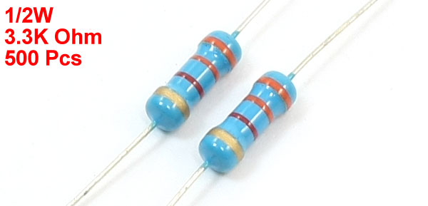 Product Name Carbon Film Resistors Material Carbon Film Power Rating 1/2W Resistance Tolerance ± 5% Resistance 3.3K Ohm Size (Approx.) 60 x 3mm / 2.4" x 0.12" (L*Max.D) Main Color Silver Tone,Blue Weight 120g Package Content 500Pcs(±2%) x Carbon Film Resistor - Reviews