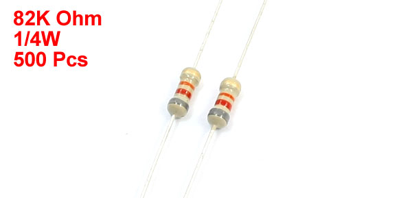 Product Name Carbon Film Resistors Material Carbon Film Power Rating 1/4W Resistance Tolerance ± 5% Resistance 82K Ohm Size (Approx.) 48 x 3mm / 1.9" x 0.12" (L*Max.D) Main Color Silver Tone, Yellowish Brown Weight 53g Package Content 500Pcs(±2%) x Carbon Film Resistor - Reviews