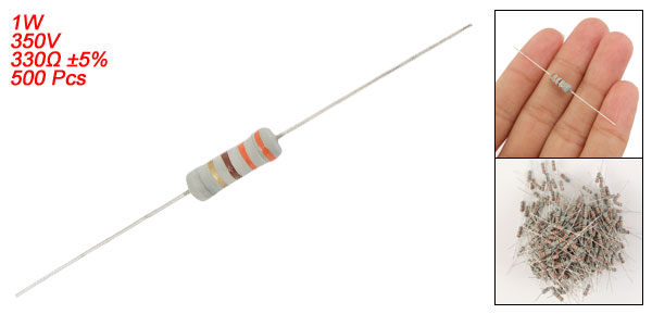 Product Name Carbon Film Resistor Material Type Carbon Film Rated Power 1 W Resistance Value 330 ohm Tolerance ±5% Withstand Voltage 350V Body Size (Approx.) 10.7 x 3.7mm /0.42" x 0.15" (L*Dia.) Lead Size (Each End) 23 x 0.4mm/0.9" x 0.016" (L*Dia.) Color As Picture Shown Weight 170g Package Content 500 Pcs(±2%) x Carbon Film Resistors - Reviews