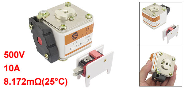 Product Name Super Rapid Fuse Model RSA-P101N Rated Voltage 500V Rated Current 10A Micro Switch Rating Power 250V 2A Resistance 8.172mΩ(25°C) Switch Total Size 4.9 x x 3.2 x 1.7cm/1.93" x 1.26" x 0.67"(L*W*T) Installing Size 6.4 x 6.4mm/0.2" x 0.2"(L*W)