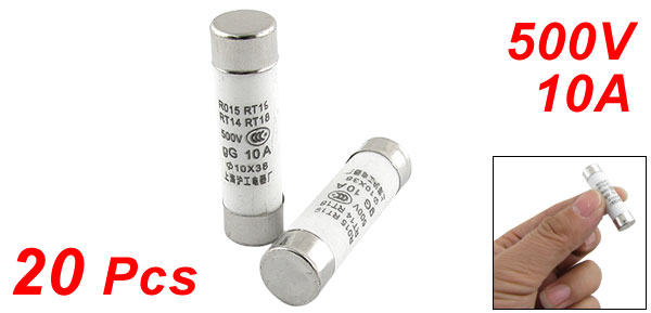 Product Name Cylindrical Fuse Link Model No. RO15 Rated Voltage 500V Rated Current 10A Specification 10 x 38mm Diameter 10mm / 0.393" Length 38mm / 1.496" Quantity 20 Material Ceramic Main Color White, Silver Tone Net Weight 125g Package Content 20 Pcs x Cylindrical Fuse Links - Reviews