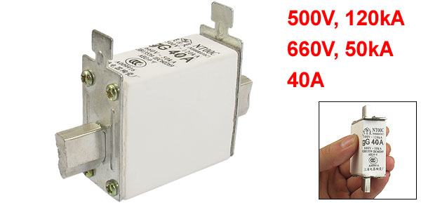 Product Name Fuse Link Model NT00C, gG 40A Rated Breaking Capacity 500V, 120kA 660V, 50kA Rated Current 40A Total Size (Approx.) 7.6 x5.2 x2.1cm / 3"x 2.1"x 0.8" (L*W*H) External Material Ceramic, Metal Color As Picture Shown Weight 115g Package Content 1 x Fuse Link - Reviews