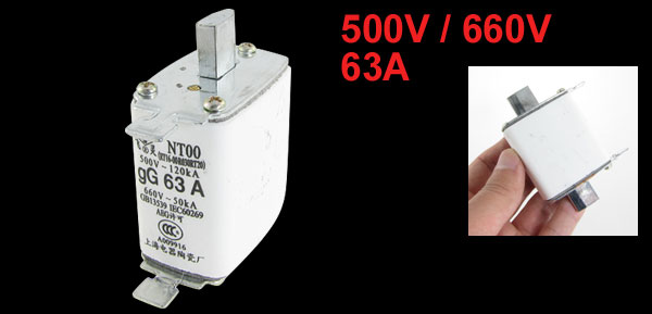 Product Name Blade Contact Fuse Link Model NT00, gG 63A Rated Breaking Capacity 500V, 120kA 660V, 50kA Rated Current 63A Main Body Size 44.4 x 29 x 49.8mm / 1.7" x 1.1" x 1.96"(L*W*H) Overall Size 57 x 29 x 77cm / 2.2" x 1.1" x 3"(L*W*H) External Material Ceramic & Metal Color White & Silver Tone Weight 150g Package Content 1 x Blade Contact Fuse Link - Reviews