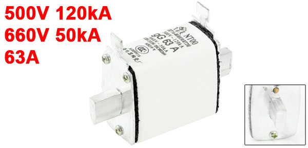 660V 50kARated Current 63A Body Size 4.97 x 2.9 x 4.4cm / 1.9"x 1.1"x 1.7" (L*W*H) Total Length 7.6cm/3" External Material Ceramic, Metal Color White, Silver Tone Net Weight 139g Package Content 1 x Fuse Link - Reviews
