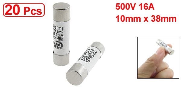 Product Name Cylindrical Fuse Link Model No. RO15 Rated Voltage 500V Rated Current 16A Specification 10 x 38mm Diameter 10mm / 0.39" Length 38mm / 1.5" Quantity 20 Material Ceramic, Metal Main Color White, Silver Tone Net Weight 120g Package Content 20 Pcs x Cylindrical Fuse Links - Reviews