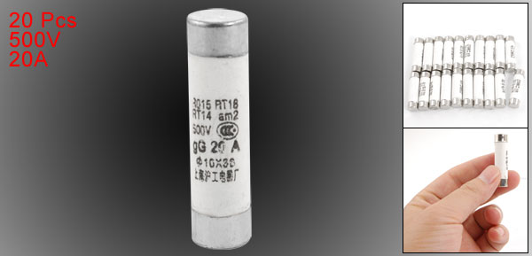 Product Name Cylindrical Fuse Model R015 Material Metal, Ceramic, Electronic Parts Rated Voltage 500V Rated Current 20A Main Color White, Silver Tone Size 10 x 38mm/0.39" x 1.4" (D*L) Weight 119g Package Content 20 x Cylinder Caps Fuse - Reviews