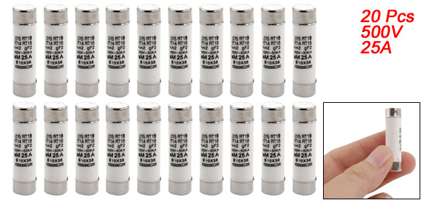 Product Name Cylindrical Fuse Model R015 Material Metal, Ceramic, Electronic Parts Rated Voltage AC 500V Rated Current 25A Breaking Capacity 50KA Main Color White, Silver Tone Size 10 x 38mm/0.39" x 1.4" (D*L) Weight 117g Package Content 20 x Cylinder Caps Fuse - Reviews