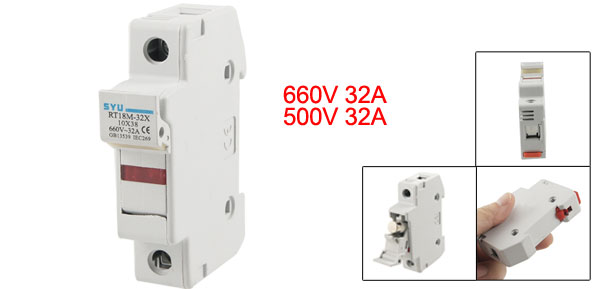 Product Name Fuse Holder + Fuse Model No. RT18M-32 Rated Voltage 660V Rated Current 32A Fuse Voltage/Current 500V 32A fit Rail Width 35mm Fuse Link Size 38 x 10mm/1.5" x 0.39"(L*Dia) Total Size 7.9 x 6.2 x 1.8cm/3.11" x 2.44" x 0.75"(L*W*T) Material Ceramic, Plastic, Metal Main Color White Net Weight 67g Package Content 1 x Fuse Holder