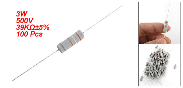 Product Name Resistors Type Metal Oxide Film Power Rating 3W Resistance Tolerance ± 5% Withstand Voltage 500V Resistance 39KΩ Lead Diameter 0.5mm / 0.019" Each Size (Approx.) 80 x 5.7mm/ 3.1" x 0.224" (L*D) Color As Picture Show Weight 154g Package Content 100(±2%) x Metal Film Resistors - Reviews
