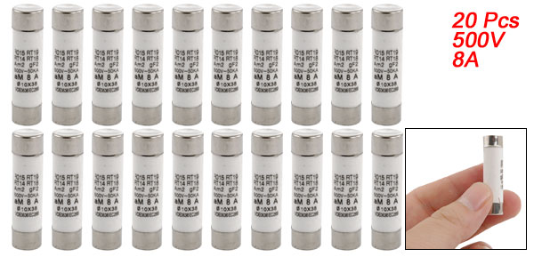 Product Name Cylindrical Fuse Model R015 Material Metal, Ceramic, Electronic Parts Rated Voltage AC 500V Rated Current 8A Breaking Capacity 50KA Main Color White, Silver Tone Size 10 x 38mm/0.39" x 1.4" (D*L) Weight 119g Package Content 20 x Cylinder Caps Fuse - Reviews