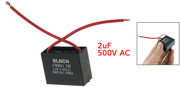 Product Name Motor Capacitor Model CBB61 Material(External) Plastic Rated Capacitance 2uF Tolerance ±5% Rated Frequency 50Hz Rated Voltage 500V AC Size 3.6 x 2.8 x 1.7cm/1.4" x 1.1"x 0.7"(L*W*T) Cable Length 8cm/3.1" Weight 21g Package Content 1 x Motor Capacitor - Reviews