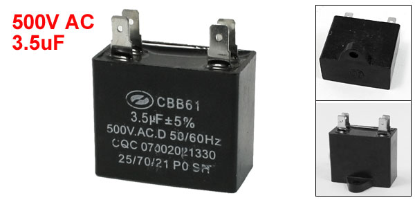 Product Name Motor Capacitor Housing Material Plastic Dielectric Material Polypropylene Film Model CBB61 Capacitance 3.5uF Tolerance ±5% Rated Voltage 500VAC Frequency 50/60Hz Pin Spacing(Approx.) 2cm/0.78'', 0.6cm/0.24'' Overall Size 3.8 x 3.2 x 2cm/1.5'' x 1.3'' x 0.78'' (L*W*H) Mounting Hole Dia 4.5mm/0.18" Color Black Weight 30g Package Content 1 x Motor Capacitor - Reviews