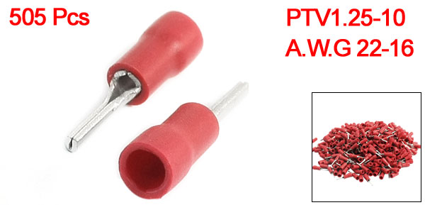 Product Name Insulated Pin Terminals Type PTV1.25-10 Design Pin Type Fit Cable Size 0.5-1.5mm² (A.W.G 22-16) Max. Current 19A Pin Dia. 2mm / 0.09" Tube Inner Dia. 4.3mm / 0.17" Total Length 22mm / 0.87" Material Metal, Plastic Color Silver Tone, Red Weight 247g Package Content 505(±2%) x Insulated Pin Terminals - Reviews