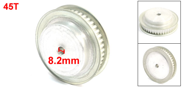 Product Name Timing Pulley Material Aluminum Color Silver Tone Number of Tooth 45T Pitch 5.08mm/1/5'' Bore Diameter 8.2mm/0.32" Top Diameter 55mm/2.2" Overall Size 80 x 25mm/3.15'' x1''(D*H) Fit Belt Width 11.5mm/0.45" Weight 250g Package Content 1 x Timing Pulley - Reviews