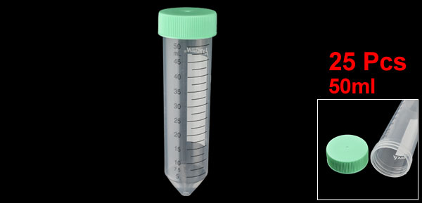 Product Name Centrifuge Tube Material Plastic Capacity 50ml/01.7oz Overall Size (Approx.) 35 x 120mm/ 1.4" x 4.7" (D*L) Color Clear White ,Green Net Weight 368g Package Content 25 x Centrifuge Tube