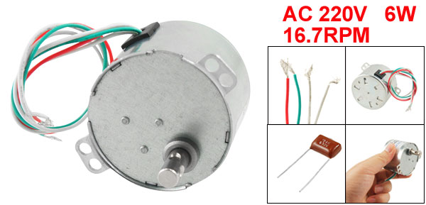 Product Name Synchronous Reduction Gear Motor Rated Voltage AC 220V Power 6W Rated Frequency 50/60Hz Speed 16.7 RPM Body Diameter 50mm / 2" Total Length 52mm /2" Bore Diameter 3mm / 0.11" Shaft Diameter 7mm/0.27" Cable Length 25cm / 9.8" Main Color As Picture Shown Material Metal Weight 204g Package 1 x Synchronous Reduction Gear Motor - Reviews