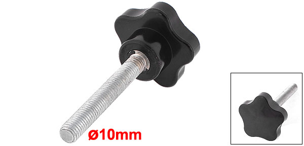 Details50mm Head Dia 10mm Male Thread Screw On Type Clamping Knob  Product Name Star Clamping Knob Type Screw On Head Diameter 50mm / 2" Thread Length 70mm / 2.8" Thread Diameter 10mm / 0.4" Total Height 99mm / 3.9" Material Metal, Plastic Color Silver Tone, Black Weight 80g Package Content 1 x Star Clamping Knob