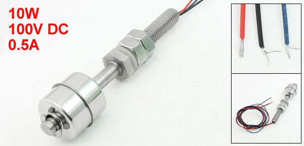 Product Name Water Level Sensor Model No. SGL-1280-S Max Contact Rating 10W Max Switching Voltage 100V DC Max Switching Current 0.5A Max Breakdown Voltage 220V DC Max Carry Current 1.0A Max Contact Resistance 100mΩ Temperature Rating -10 - +60 °C / 85 °C Float Ball Material Stainless Steel Float Body Material Stainless Steel Float Ball Size(Approx) 26 x 25mm / 1.1" x 1"(L*D) Thread Size 10 x 50mm / 0.39" x 2"(D*L) Bottom Clip Dia(Approx) 14.8mm / 0.58" Float moving distance 50mm Body Total Length(Approx) 110mm /4.3" Cable Length 20cm / 8" Color Silver Tone Net Weight 75g Package Content 1 x Water Level Sensor - Reviews
