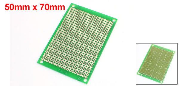 Product Name Universal PCB Board Hole Dia(Approx) 1mm / 0.039" Hole Pitch(Approx) 2.54mm / 0.1" Size(Approx) 50 x 70mm / 2" x 2.8"(W*L) Thickness(Approx) 1.6mm / 0.063" Material FR-4 Color Silver Tone, Green Net Weight 10g Package Content 1 Pcs x Universal PCB Board - Reviews