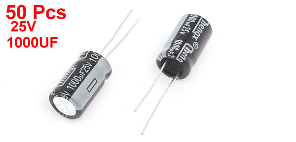 Product Name Electrolytic Capacitor Type Radial Leads Temperature Range -40~+105°C Voltage 25V Capacitance 1000uF Body Size 10 x 17mm/0.4" x 0.67"(D*H) Lead Space 4.5mm/0.18" Lead Length 20mm/0.8" , 25mm/1" External Material Aluminum Total Net Weight 101g Main Color Black Package Content 50(+/-2%)x Electrolytic Capacitors - Reviews