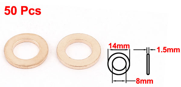 Details50PCS 14mm OD 8mm ID 1.5mm Thick Copper Washer Flat Ring Oil Brake Line Seal  Product Name Copper Washer Total Size 8 x 14 x 1.5mm /0.31" x 0.55" x 0.06"(Inner Dia*OD*T) Material Copper Color Copper Tone Net Weight 60g Package Content 50 x Copper Washers