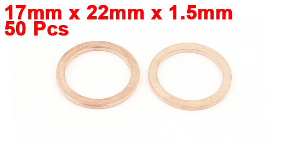 Details50pcs 17x22x1.5mm Copper Flat Washer Gasket Seal Ring Fasteners for Industry  Product Name Copper Washer Total Size 17 x 22 x 1.5mm/0.67" x 0.87" x 0.06"(Inner Dia*OD*T) Material Copper Color Copper Tone Net Weight 90g Package Content 50 (+/-2%) x Copper Washers