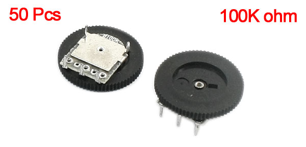 Product Name Wheel Potentiometer Model B100K Resistance Value 100K ohm Features 5-Pin Wheel Size 18 x 3mm / 0.71" x 0.12"(D*T) Material Metal ,Electronic Parts Weight 45g Package 50Pcs(±2%) x Wheel Potentiometer - Reviews