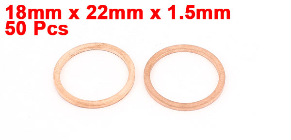 Details50pcs 18x22x1.5mm Copper Flat Ring Washer Gaskets Seal Fitting for Industrial  Product Name Copper Washer Total Size 18 x 22 x 1.5mm/0.7" x 0.86" x 0.06"(Inner Dia*OD*T) Material Copper Color Copper Tone Net Weight 68g Package Content 50(+/-2%) x Copper Washers