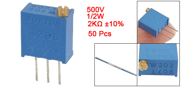 Product Name Cermet Potentiometer Model 3296W-1-202 Quantity 50±2% Pcs Withstand Voltage 500V Rated Power 1/2W Resistance Value 2K Ohm(2, 000ohm) Tolerance ±10% Adjustment Tyoe Top Adjustment Mounting Type Through Hole(DIP) Turn Number 25 Resistance Change Type Linear Resistive Material Cermet Temperature Coefficient ±100ppm/°C Square Body Size 9 x 9mm/ 3/8" x 3/8" (L*W)