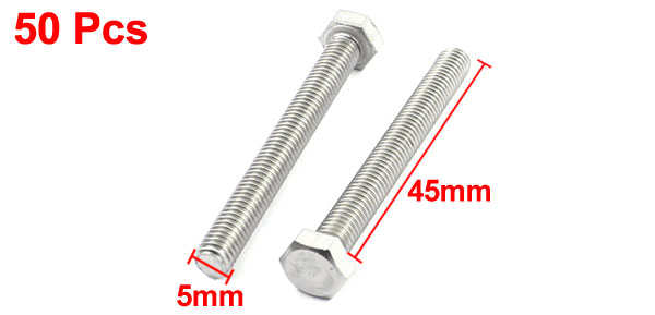 50Pcs 45mm Length 5mm Thread Hex Head A2-70 Stainless Steel Screw Bolt